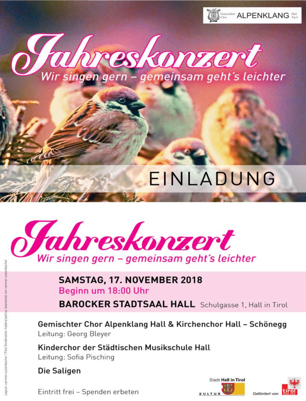 Gemeinsam mit dem Kinderchor der Städtischen Musikschule Hall und unterstützt von „Die Saligen“ sangen und spielten wir vor einem vollbesetzten Barocken Stadtsaal. Georg Bleyer verstand es durch seine Inszenierung, dass Publikum zum Mitsingen zu bewegen. Wir wurden mit sehr viel Applaus bedacht, konnten wir doch unser Motto „Wir singen gern - gemeinsam geht’s leichter“ vermitteln. Entzücken und besonderen Applaus riefen die Beiträge des Kinderchores hervor.